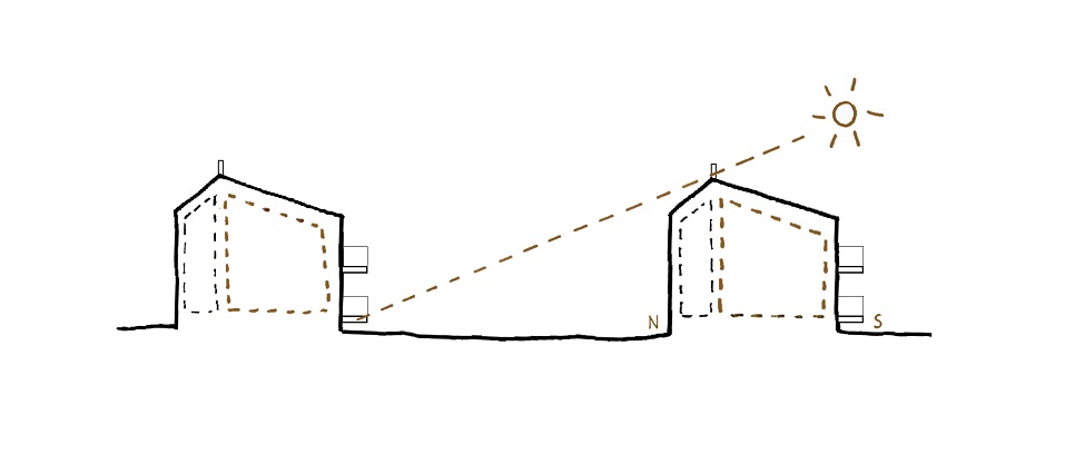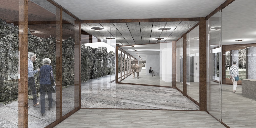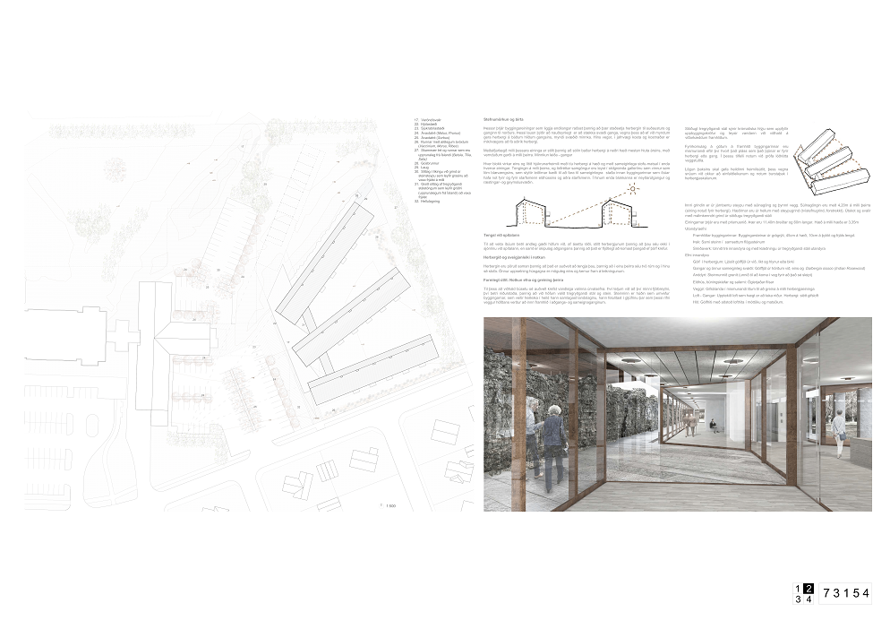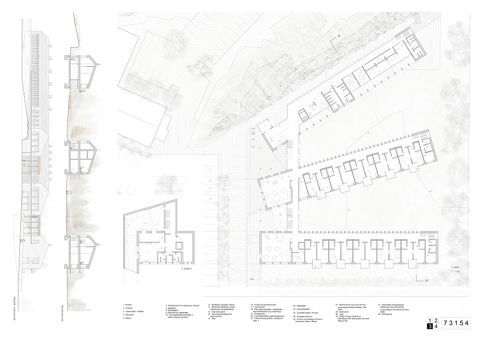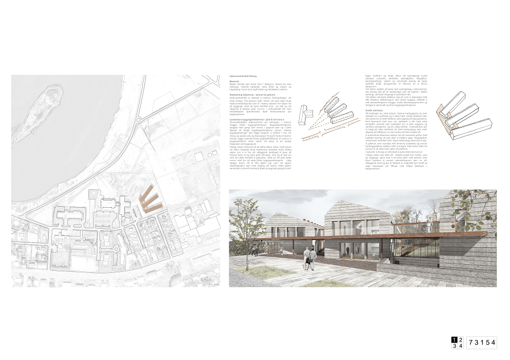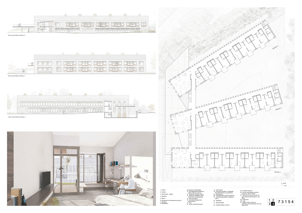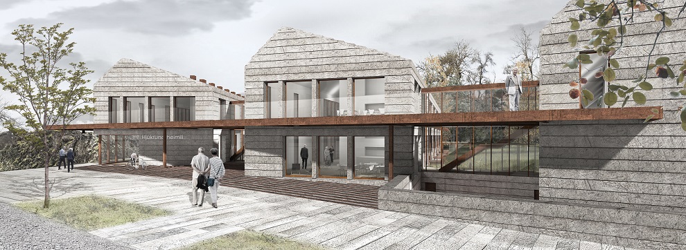 The Icelandic Ministry of Health and Welfare launched an architecture competition to build a Nursing Home in Selfoss town center. In our proposition, bedrooms are set in three two-storey buildings, which makes them the main part of the program. They are arranged fan-shaped and connected to each other through a gallery, allowing natural light to fill the space. - Árvegur, Selfoss, Iceland –