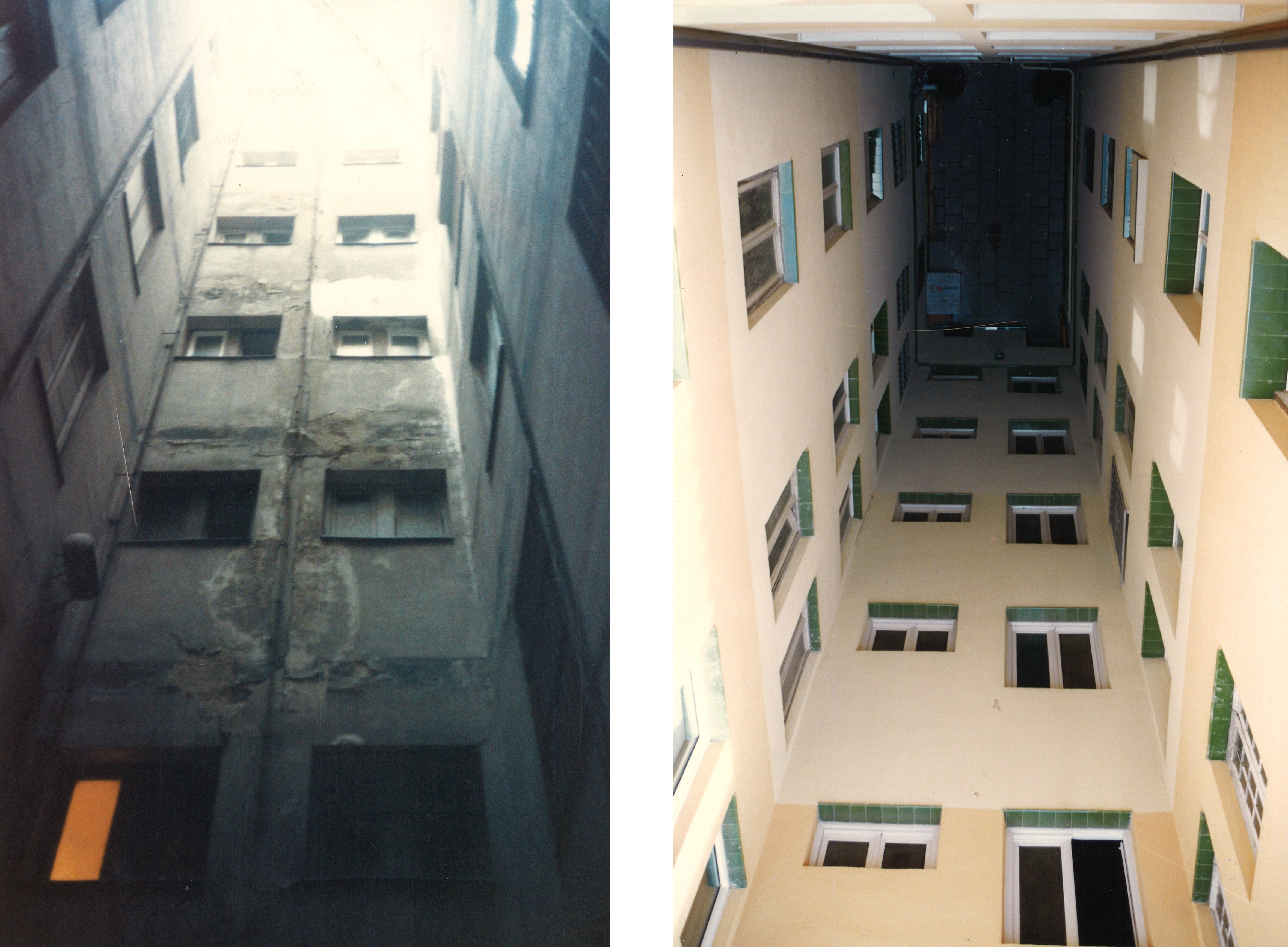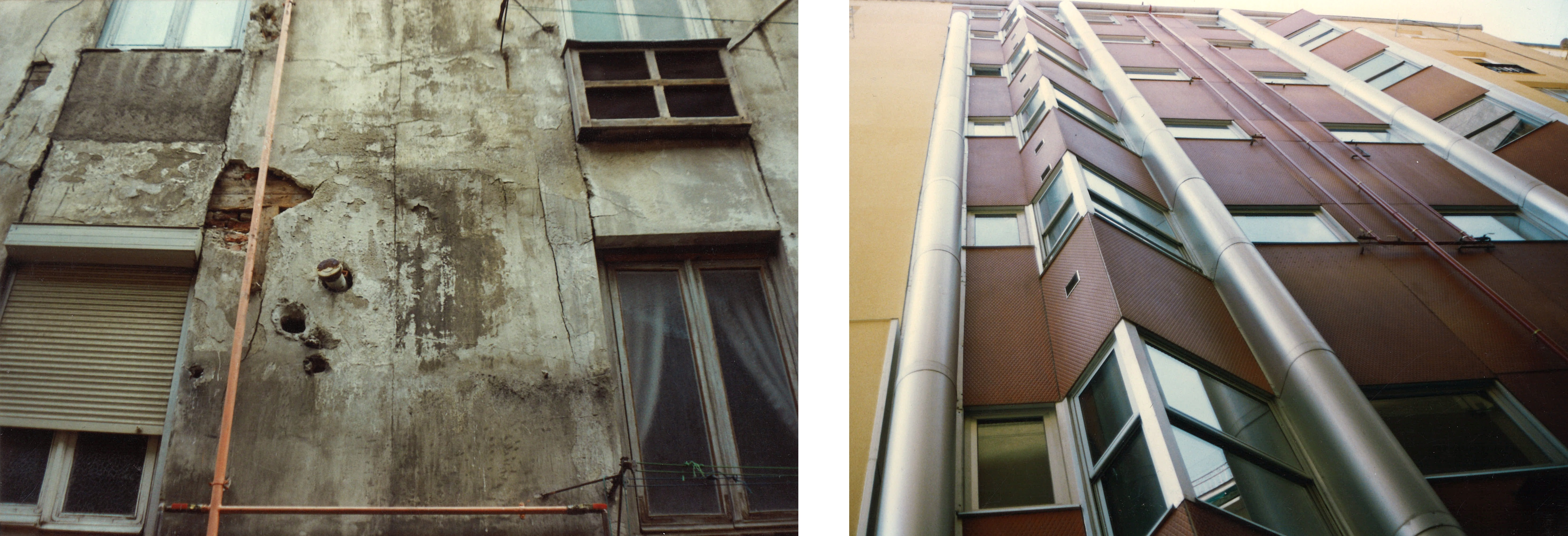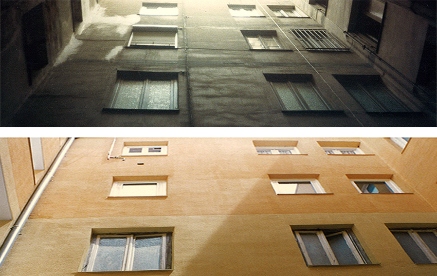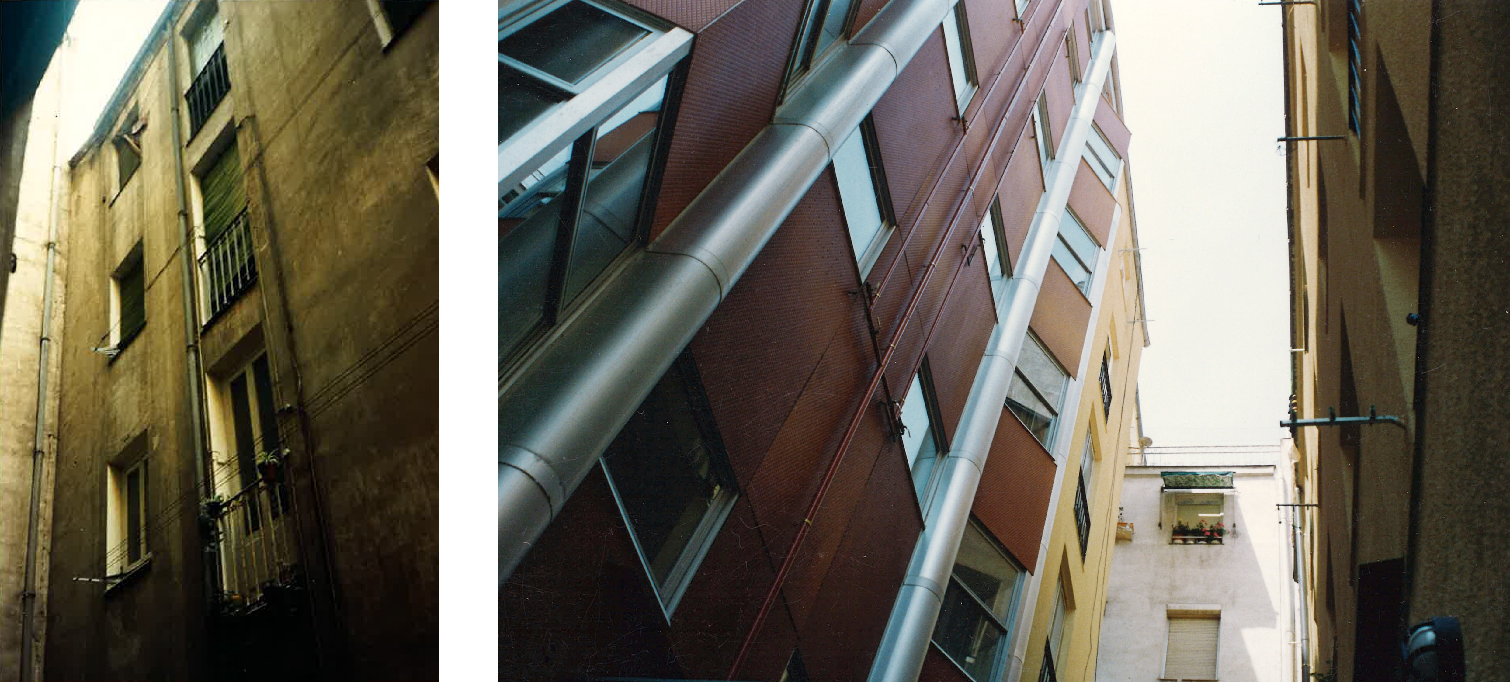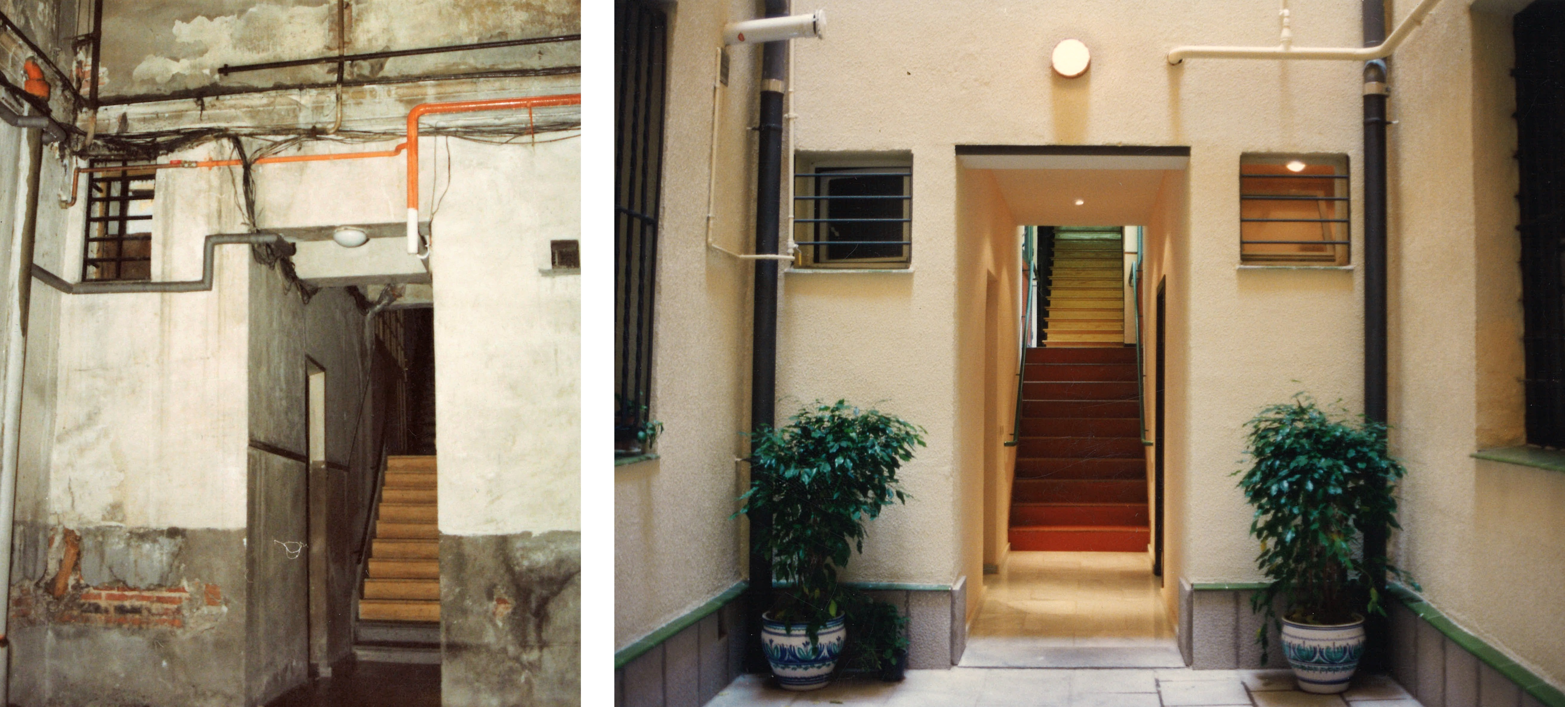 It is a residential building with a serious pathology on its bearing structure that suffered some partial subsidence of floors in the most affected areas by humidity. The building is in turn afflicted by an attack of xylophages and by the incursion of the roots of the neighboring poplars on its masonry foundations. The absence of the adjoining building on its right party wall aggravates the situation as this party wall leans over the void. Security measures regarding access to the houses will be adopted and the dividing walls will be propped up to collect the horizontal forces caused by the collapse of the vertical facing.