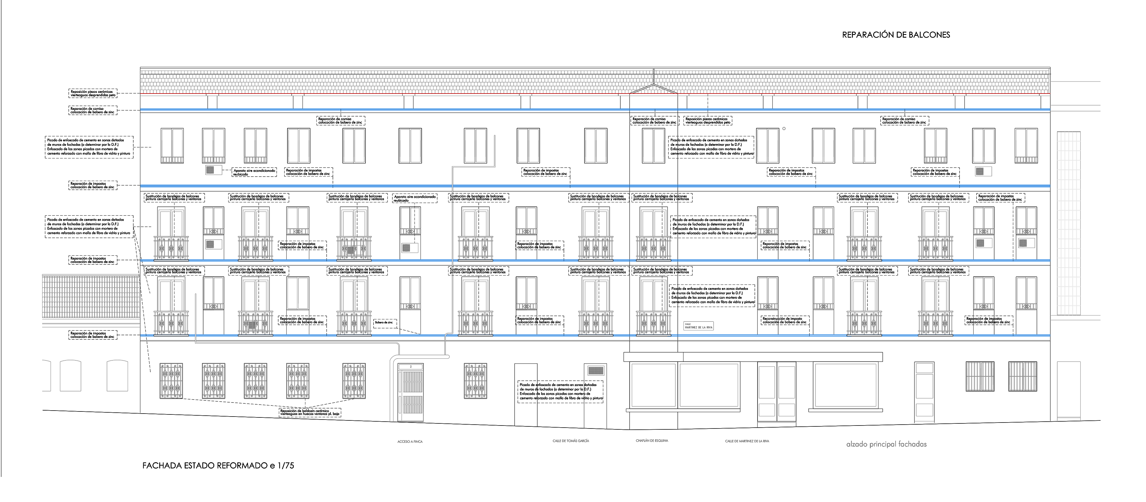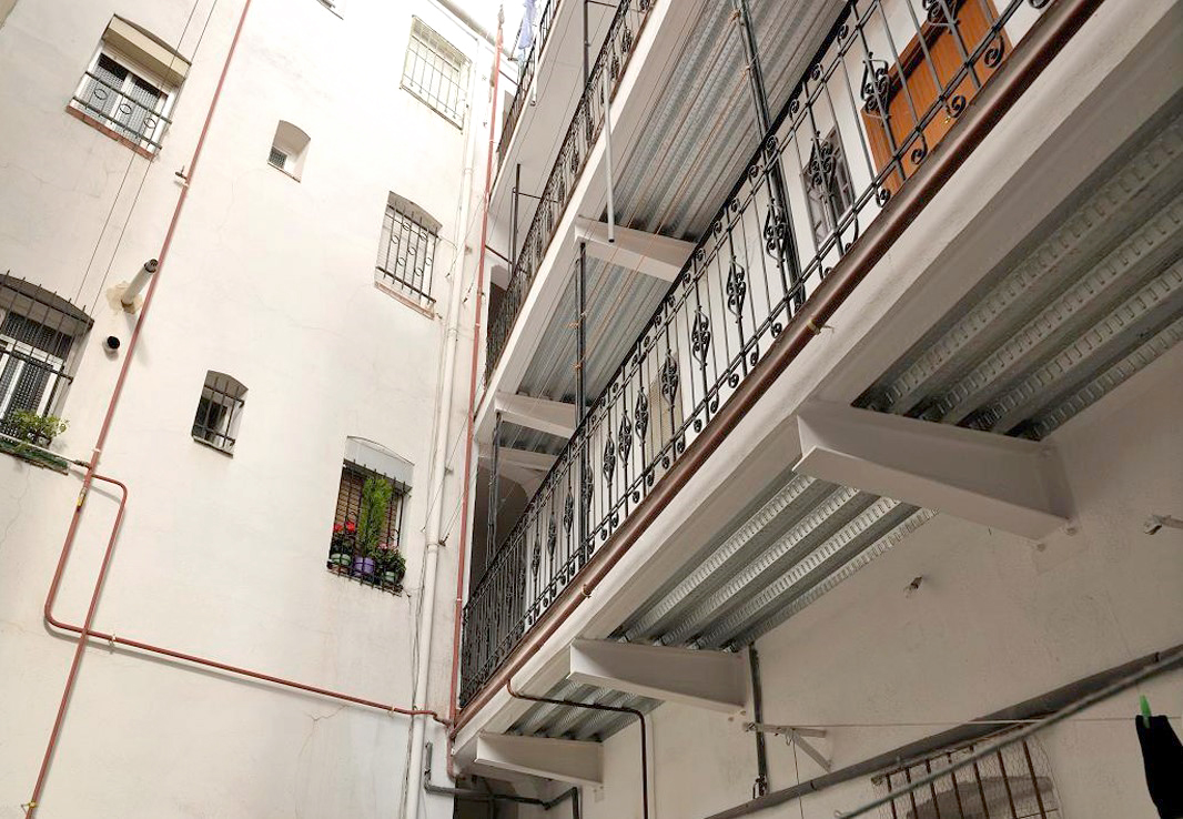 In this rehabilitation, the edges of the cantilevers that form the access corridors to the first, second and third floors will be repaired. It was detected that the metal joists of the corridors show an advanced state of corrosion, but the intention is to rebuild them without removing the corroded joists. It was decided to build a composite floor slab supported by corbels embedded in the load-bearing wall. The slab is assembled on top of the supporting plates and the concrete is poured, embedded in the old joists. Also, fissures on the third floor due to waterproofing problems are resolved.