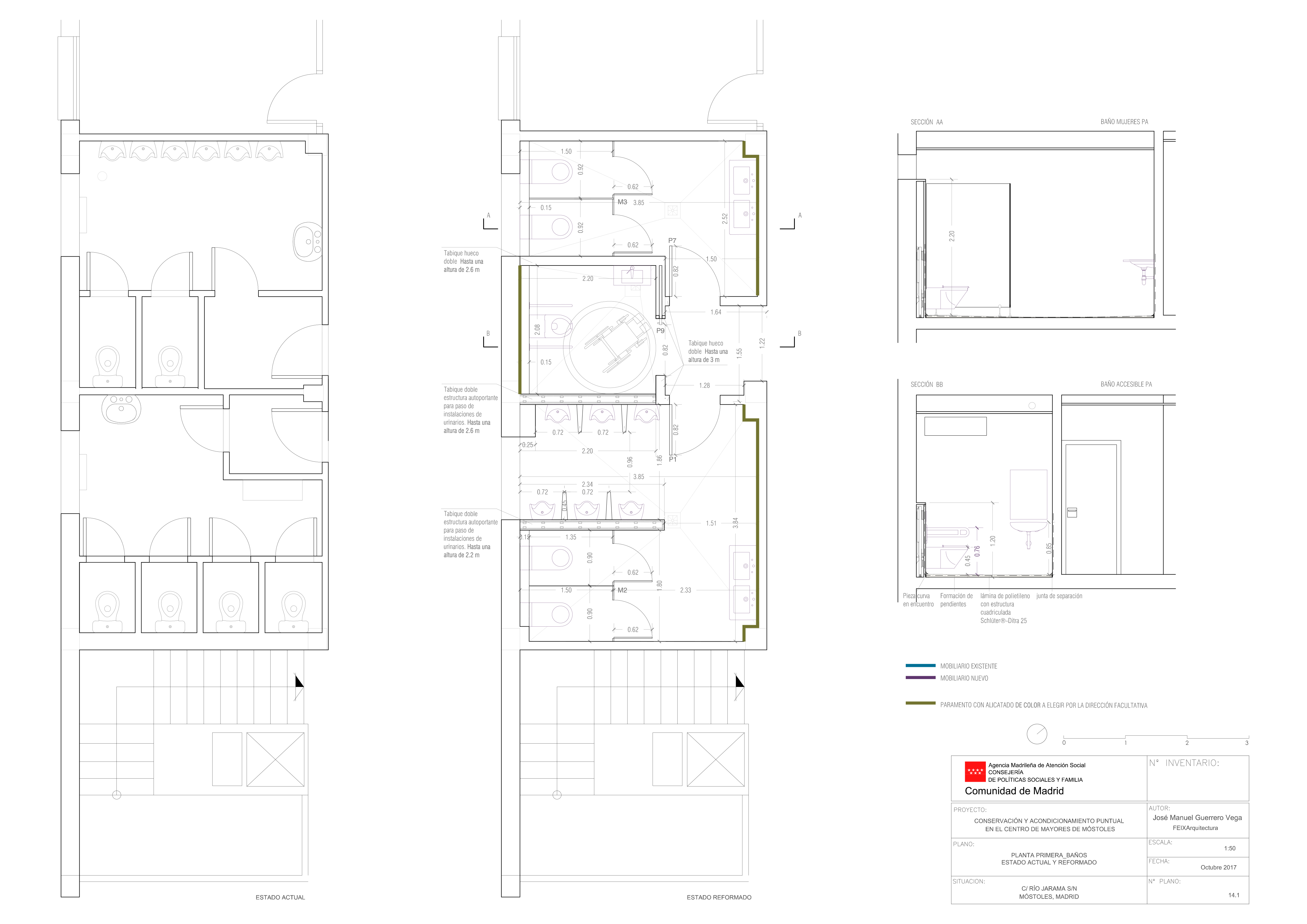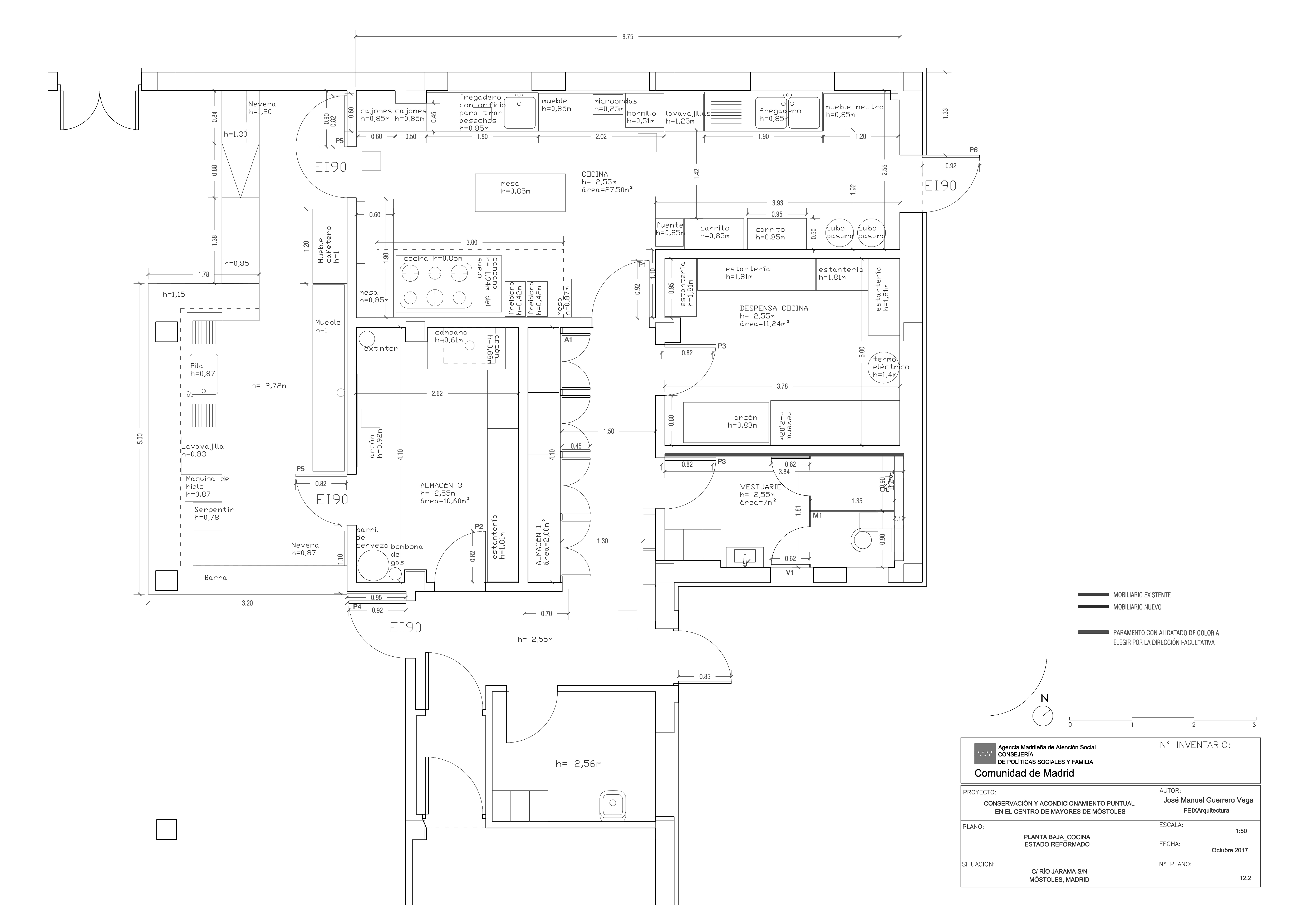 One of the main objectives of the project is to improve the operation and facilities of the kitchen. For this, it was decided to expand the area of the kitchen and transform one of the small cleaning warehouses into cupboards-shelves arranged in an organized way in the new corridor, which has allowed to gain more space and create a more efficient use of it. Another of the main changes in the kitchen is the opening of a new door on the façade in order to improve circulation. The new organization allows to have two separate routes that prevent the crossing of both.