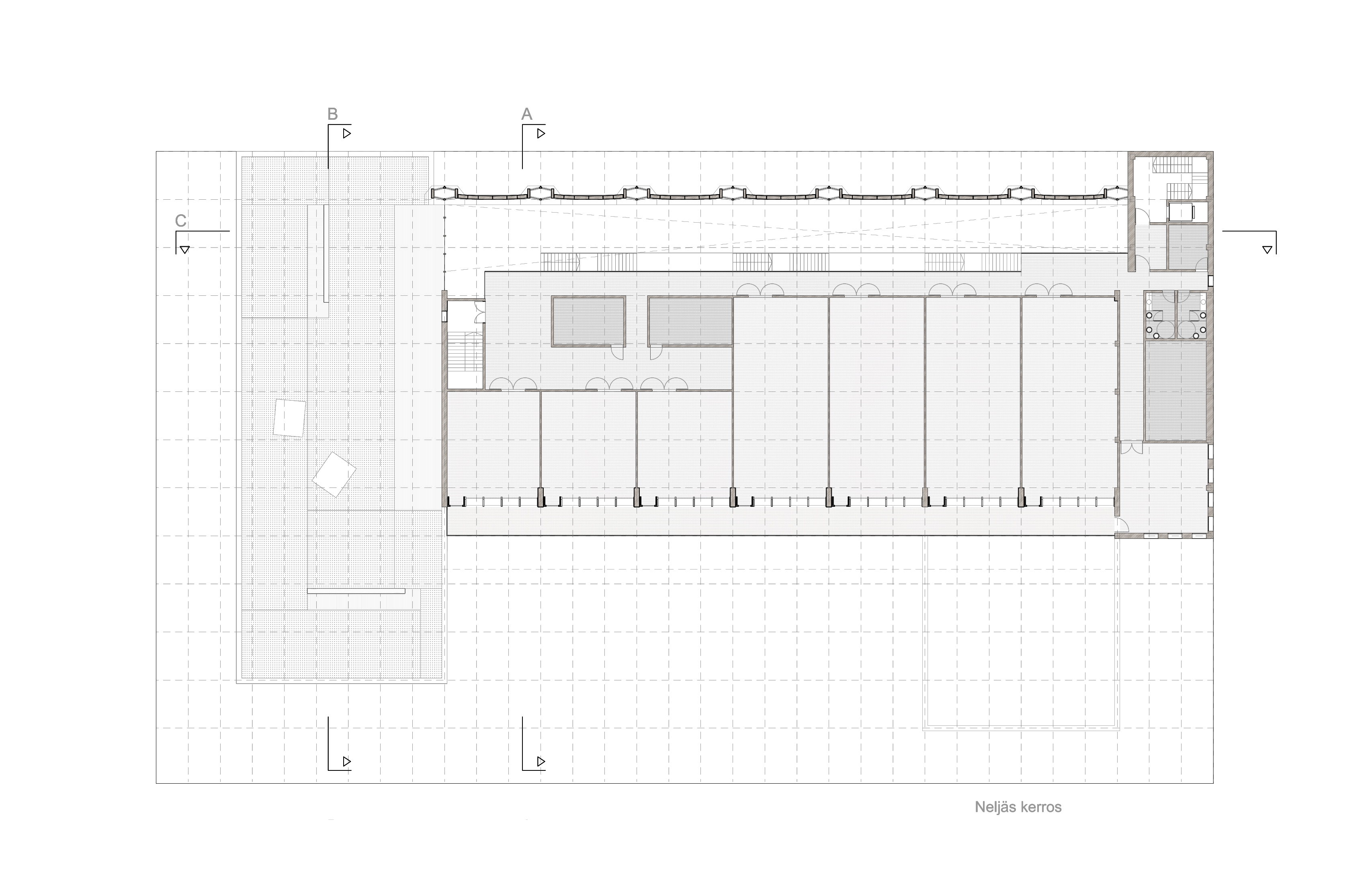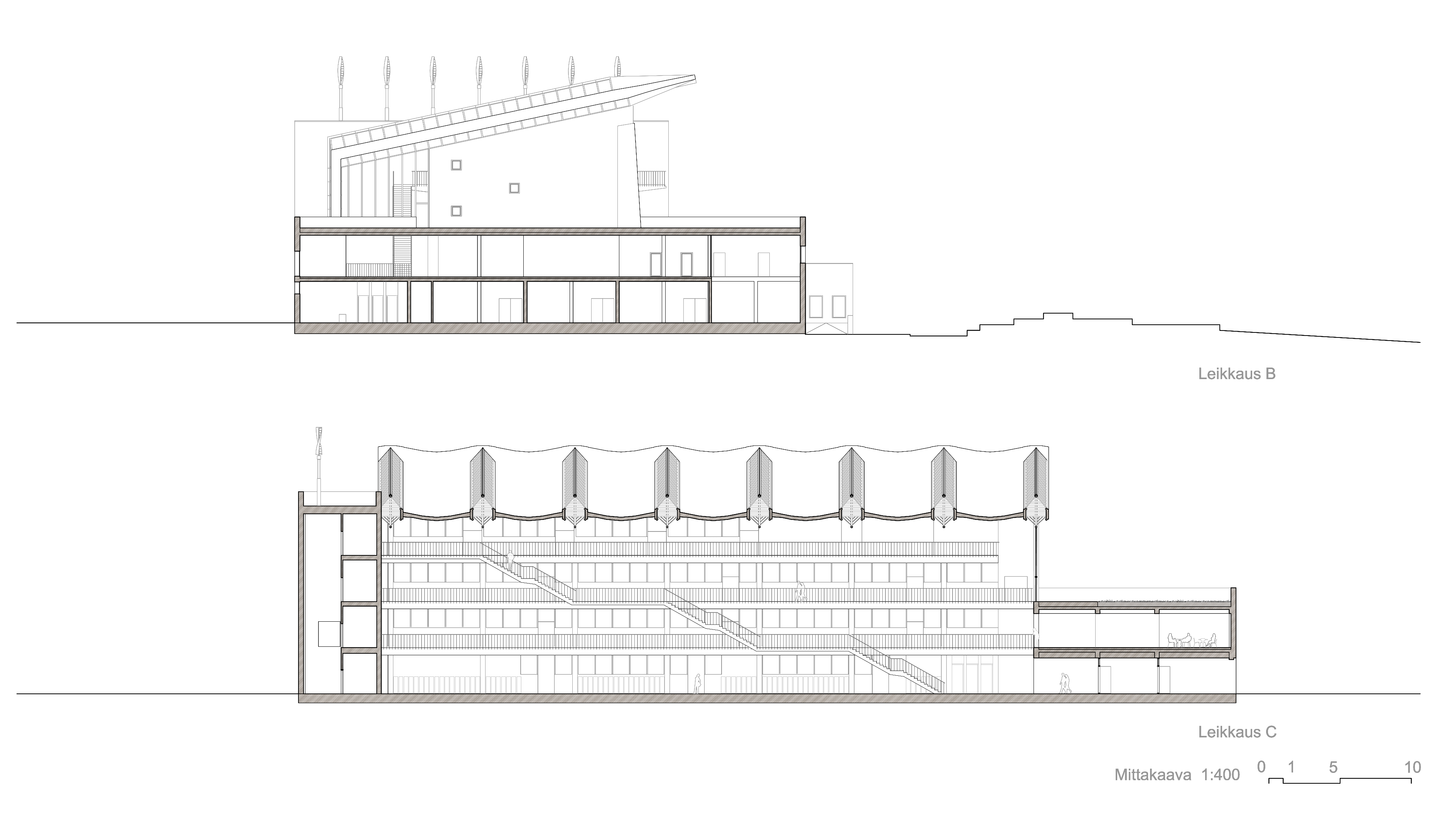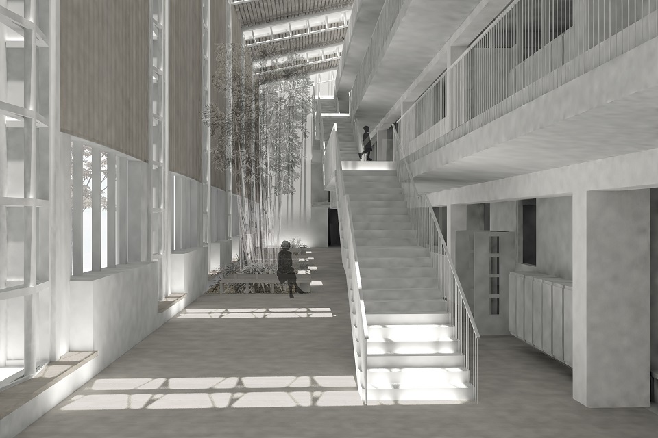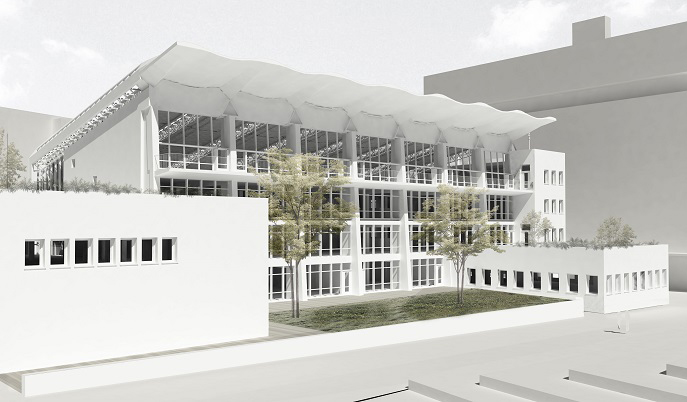 The programme is organised volumetrically with a clear division between teaching, administrative and service areas. The body dedicated to classrooms and workshops volumetrically marks the complex, with its large south-facing windows that bring the maximum amount of light into the classrooms.