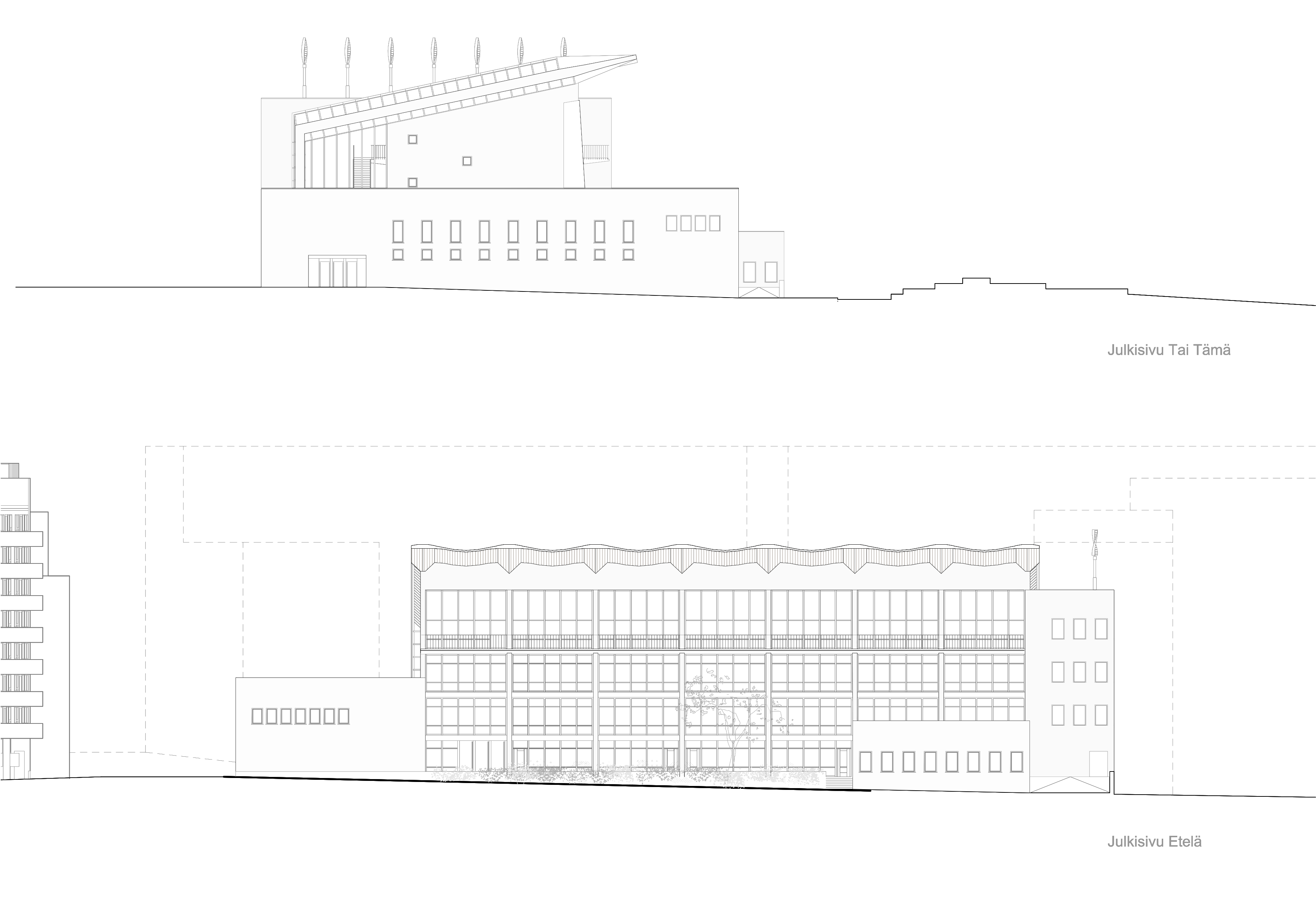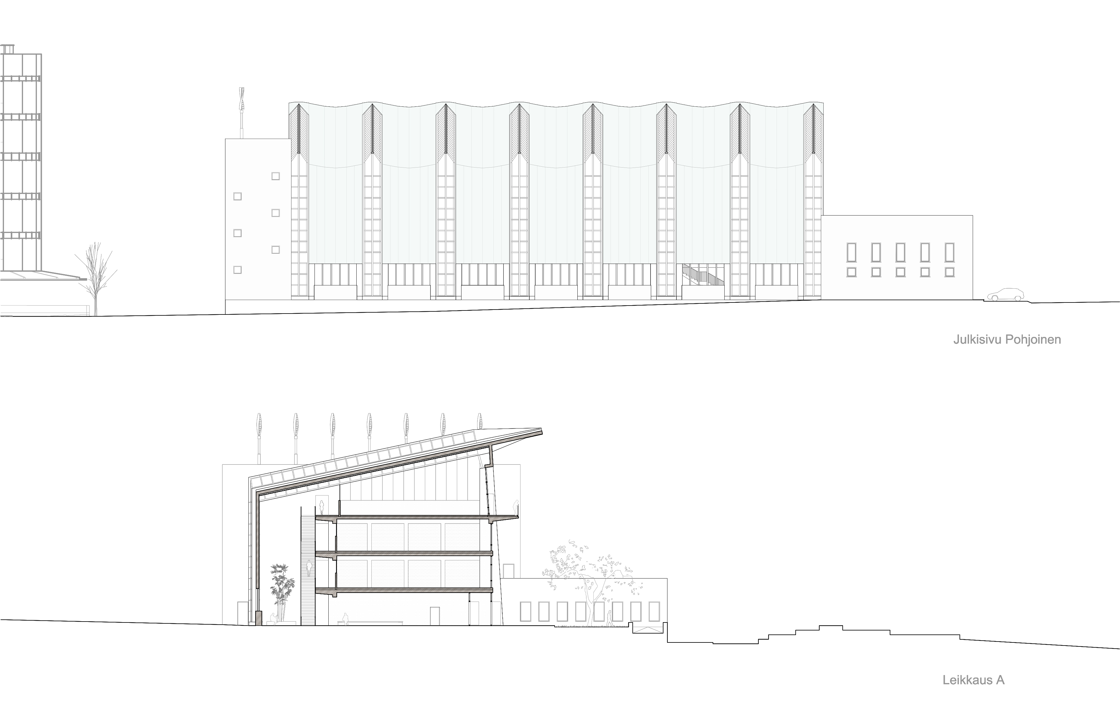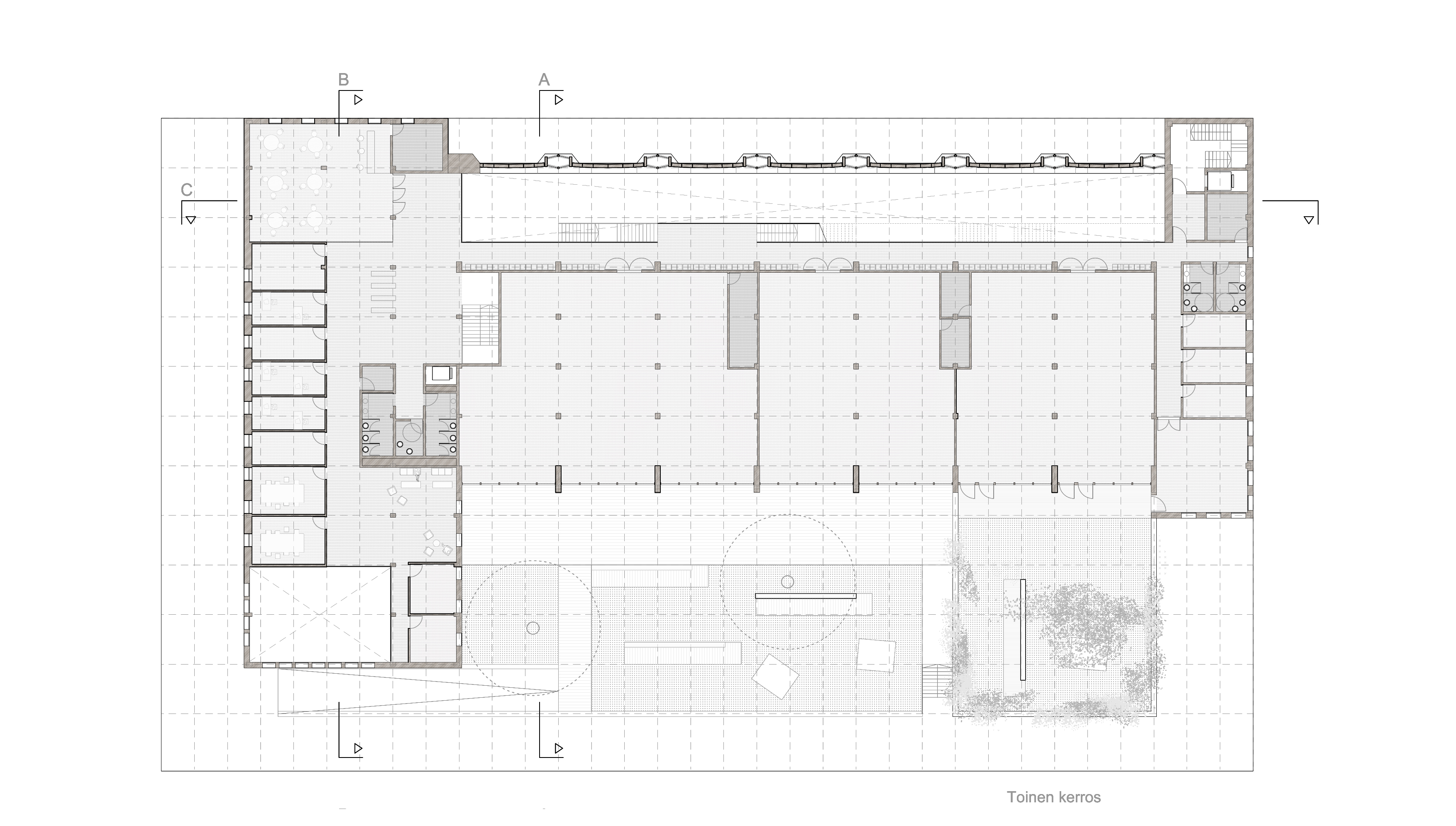 The programme is organised volumetrically with a clear division between teaching, administrative and service areas. The body dedicated to classrooms and workshops volumetrically marks the complex, with its large south-facing windows that bring the maximum amount of light into the classrooms.