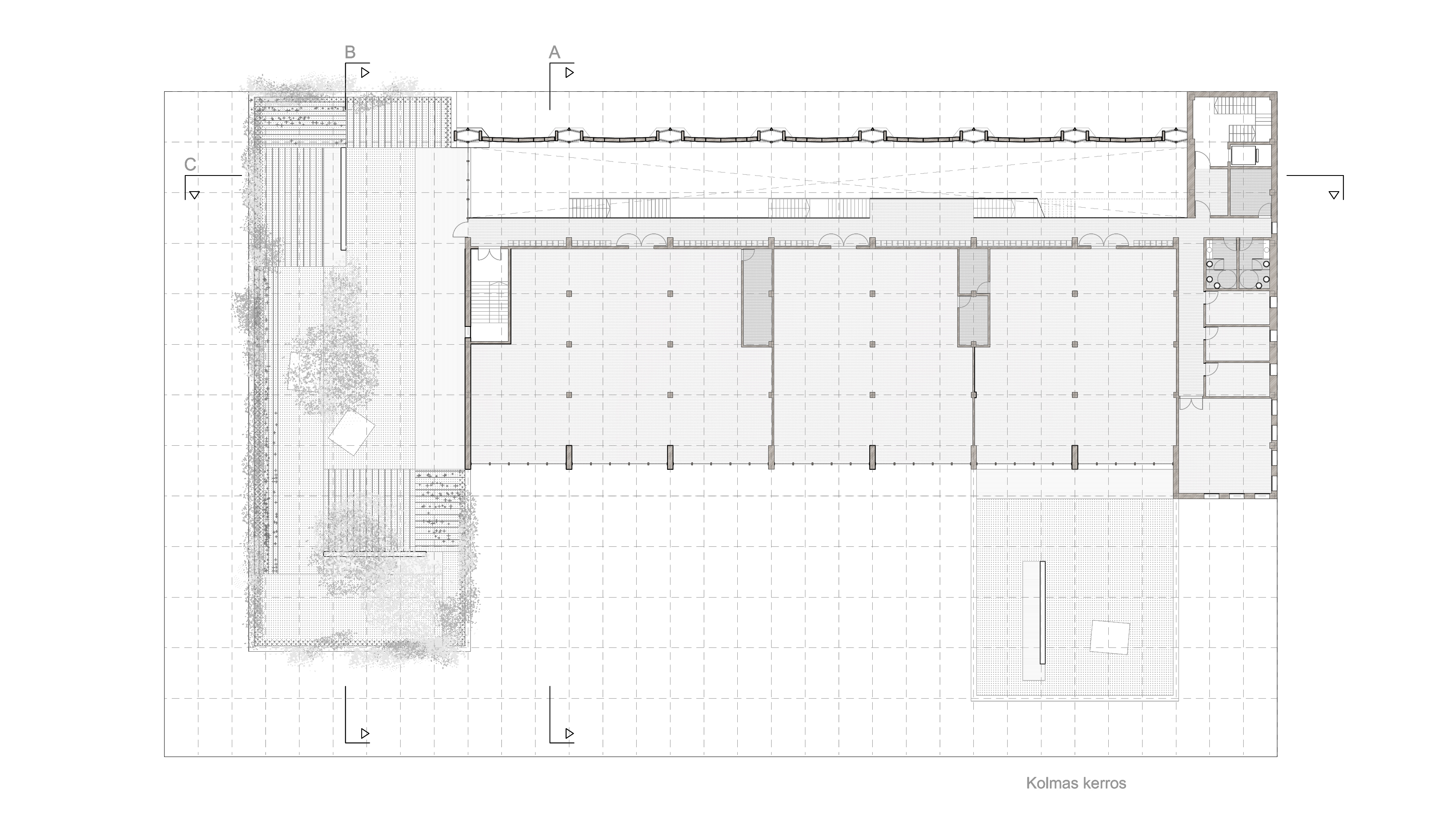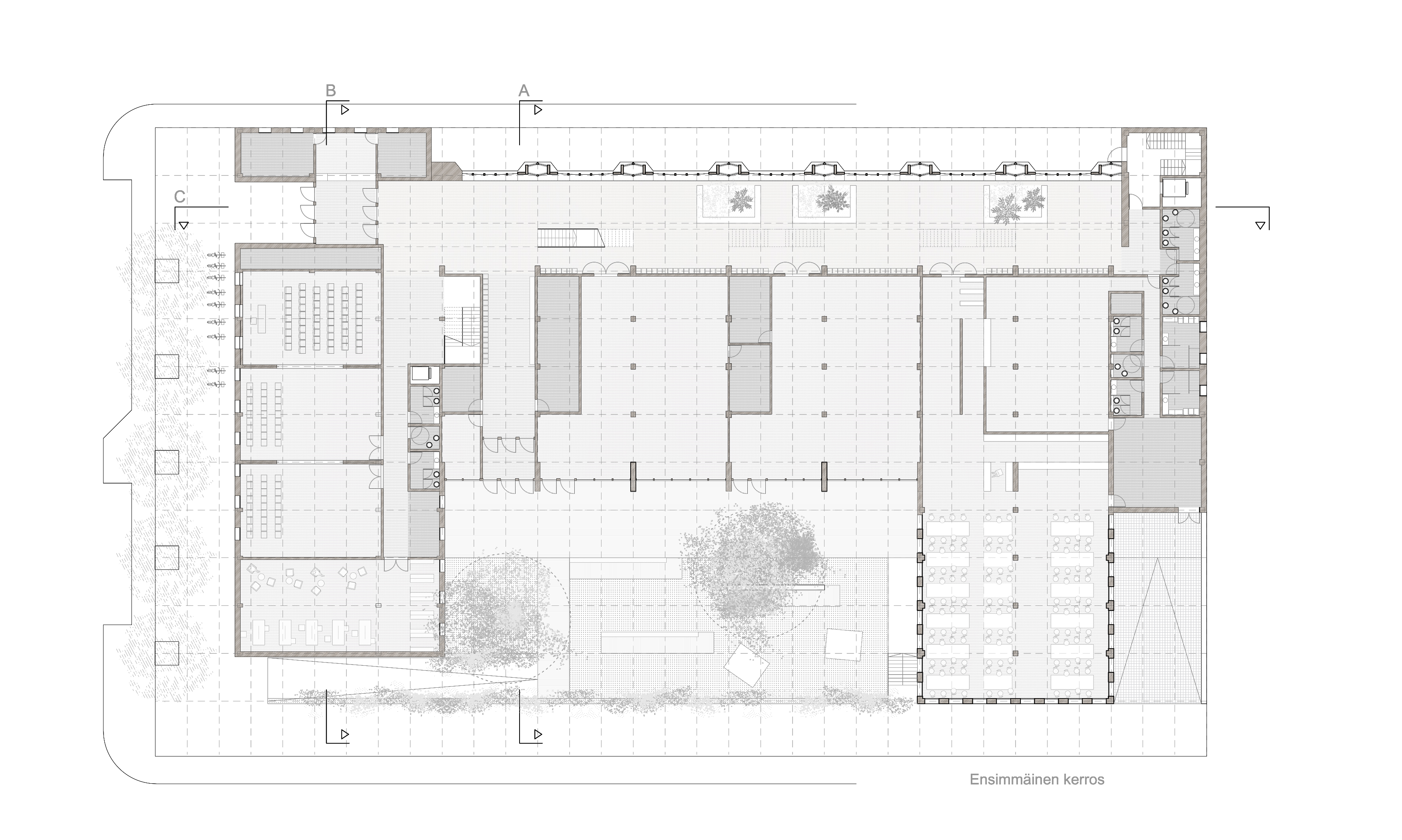 This separation between the classroom and administrative areas allows the building to be used at times and on days other than school use, as the building is easily sectorised. In addition, the ground floor is flexible, so that, depending on the needs, spaces for different activities can be added, leaving the classrooms out of the area. The circulation flows of the server spaces are independent of the operation of the rest of the building, in order to enhance the flexibility of the use of the building outside school use.