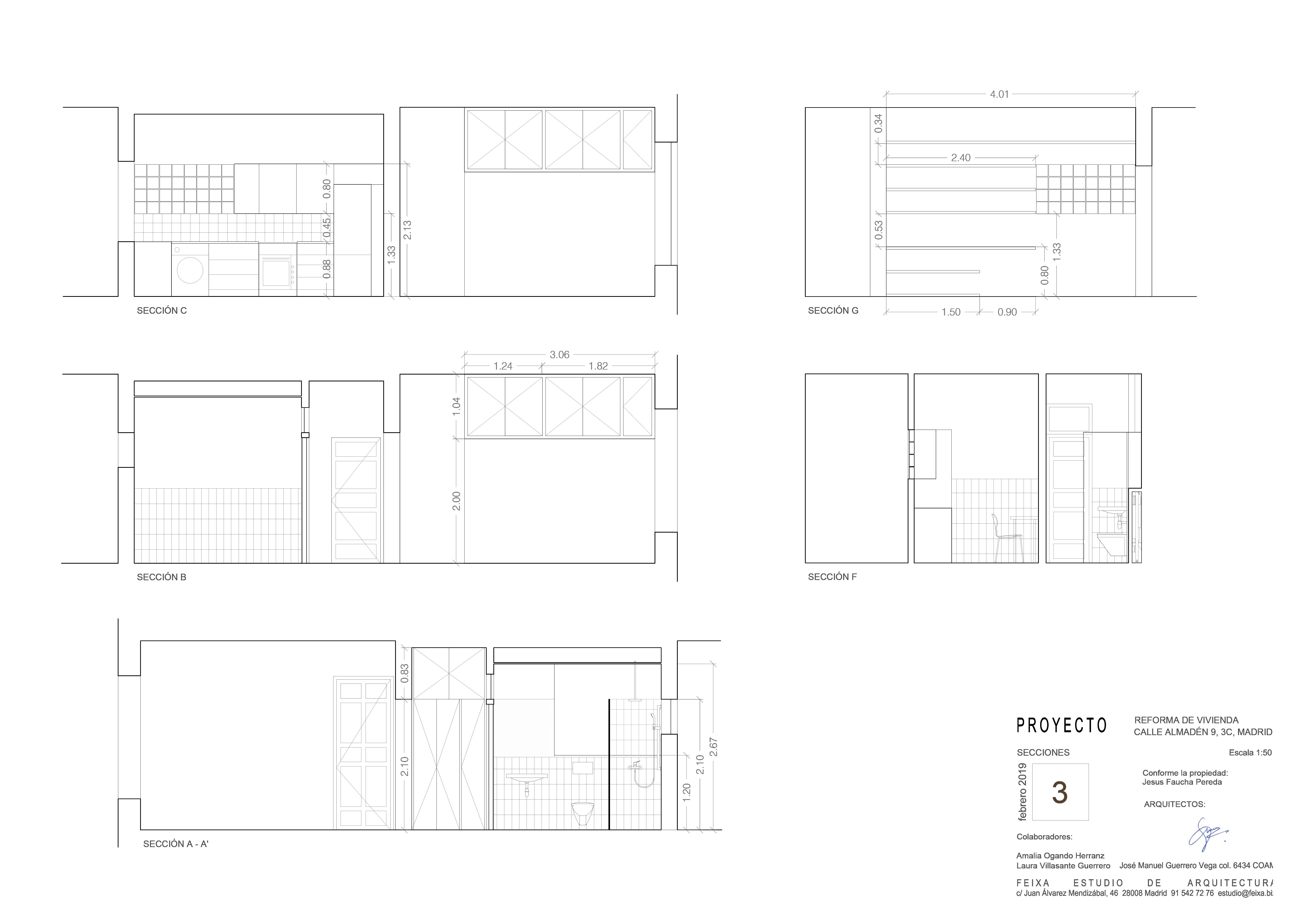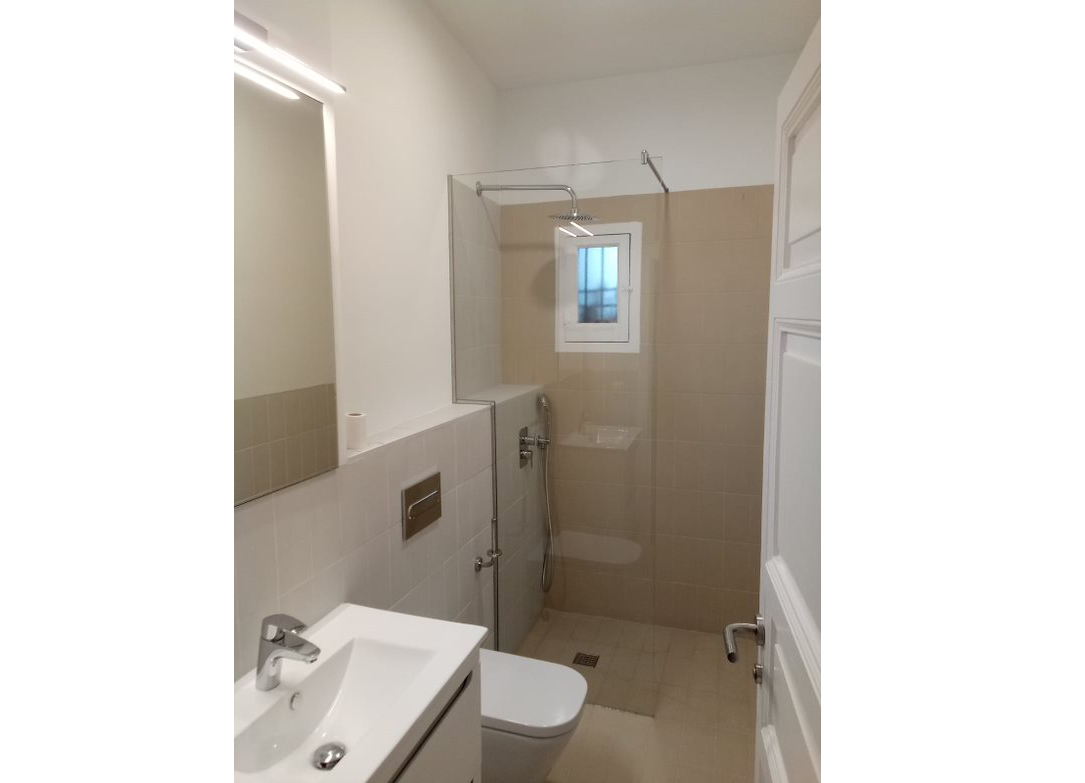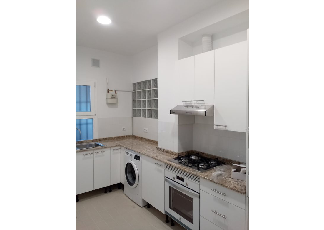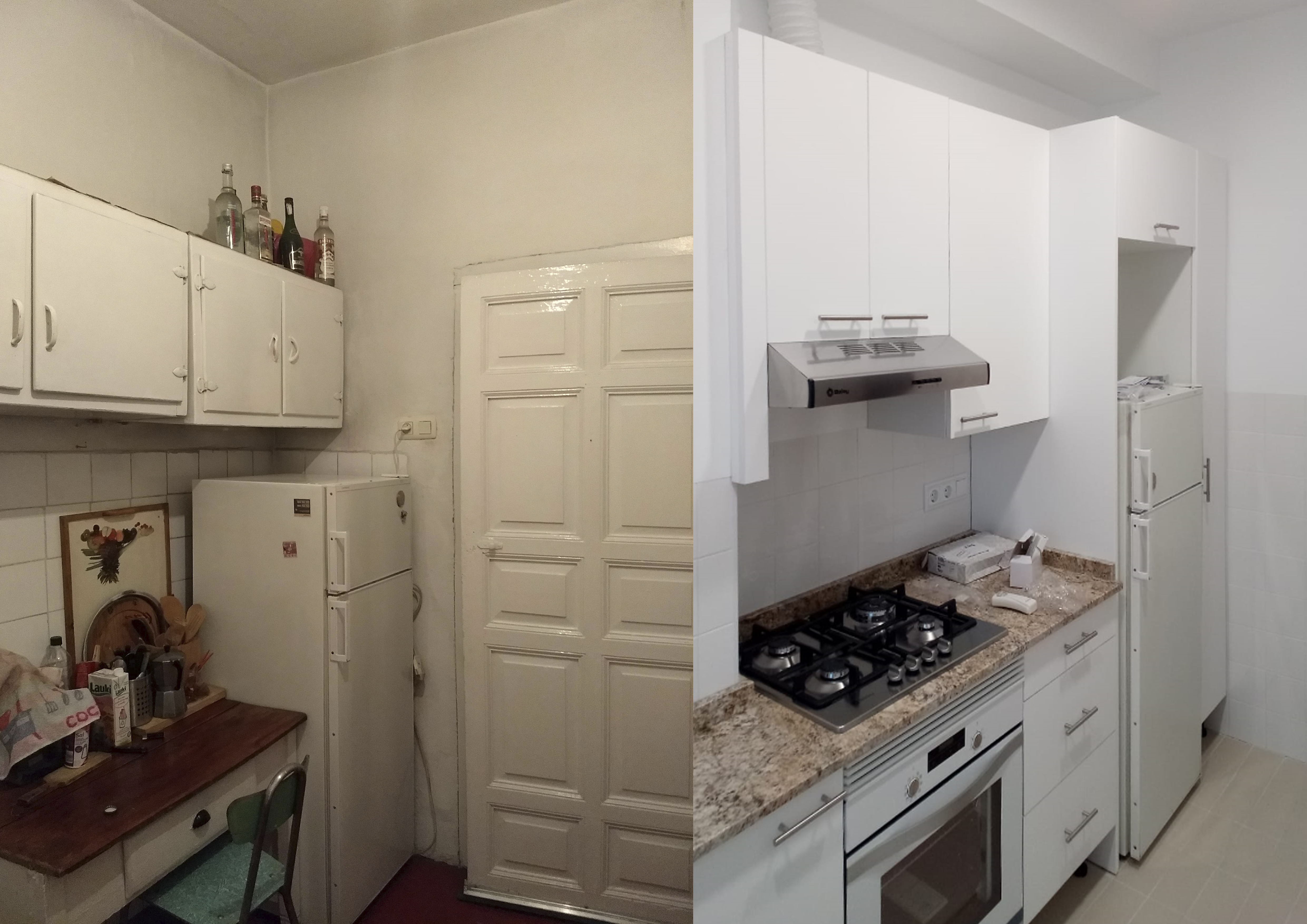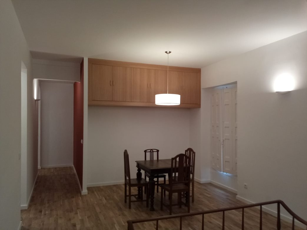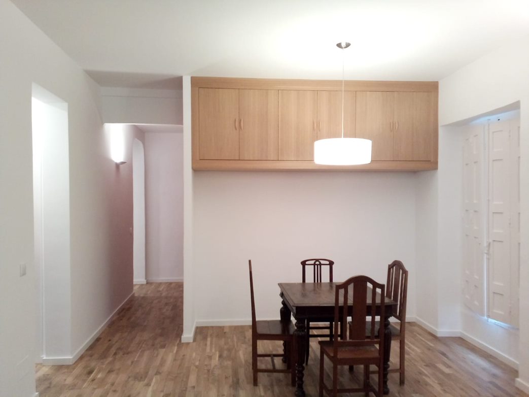 It is necessary to demolish the partitions to reorganize the kitchen and bathroom and to obtain a unique space for the living room and dining room where the two bedrooms used to be. The flooring is demolished for the installation of an oak wood flooring throughout the house except in the kitchen and the bathroom where ceramic flooring is installed. The carpentry of the doors and windows will be reused and restored where some wooden windows are replaced by aluminum windows, maintaining the current carpentry design.